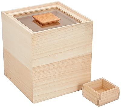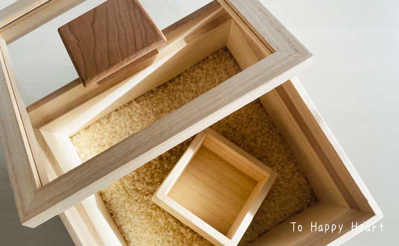 米びつの購入を考えていた時に見たホーローやガラス製の米びつには、プラスチックの計量カップの付属がほとんどだったのですが、こちらは桐性の枡が付属になっていてまさに理想的でした。
